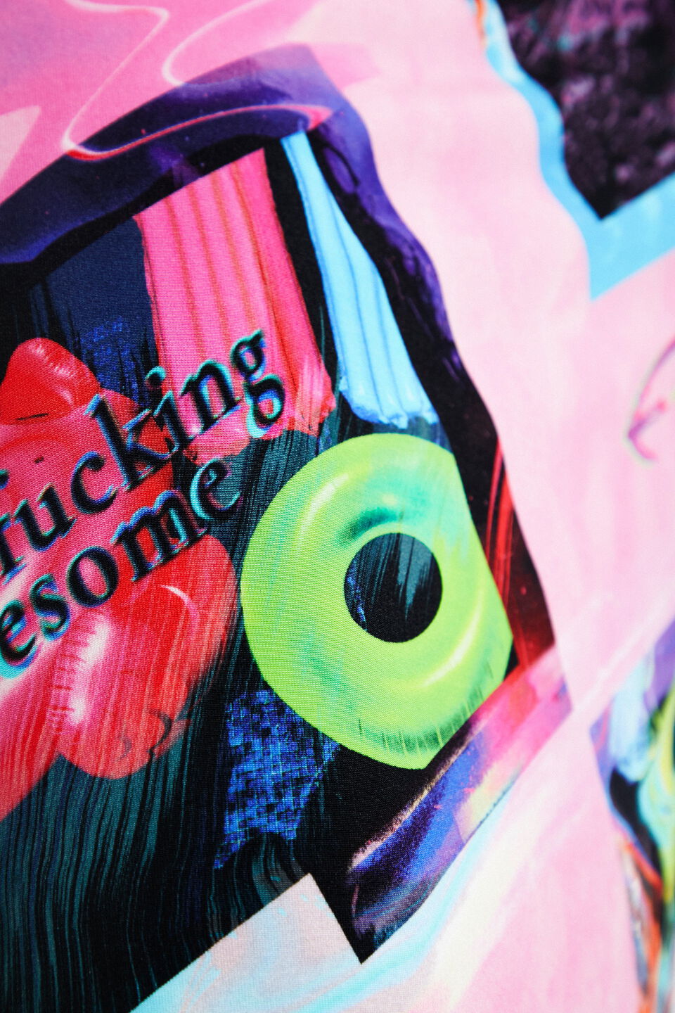 Strappy, body-hugging Desigual Neo Tropic midi dress on a vibrant pink base, with digital, pop-art effect collage pattern. Softly draped, cowl neckline creates a feminine décolletage, while the crossed, thin straps at the back dramatically leave the shoulders bare. Its stretchy, smooth-touch fabric beautifully follows your shape, and the side slit provides sexy yet comfortable movement. Contrasting neon details and English text graphics make it a statement piece – perfect for festivals, parties, or any occasion when you really want to show your personality.