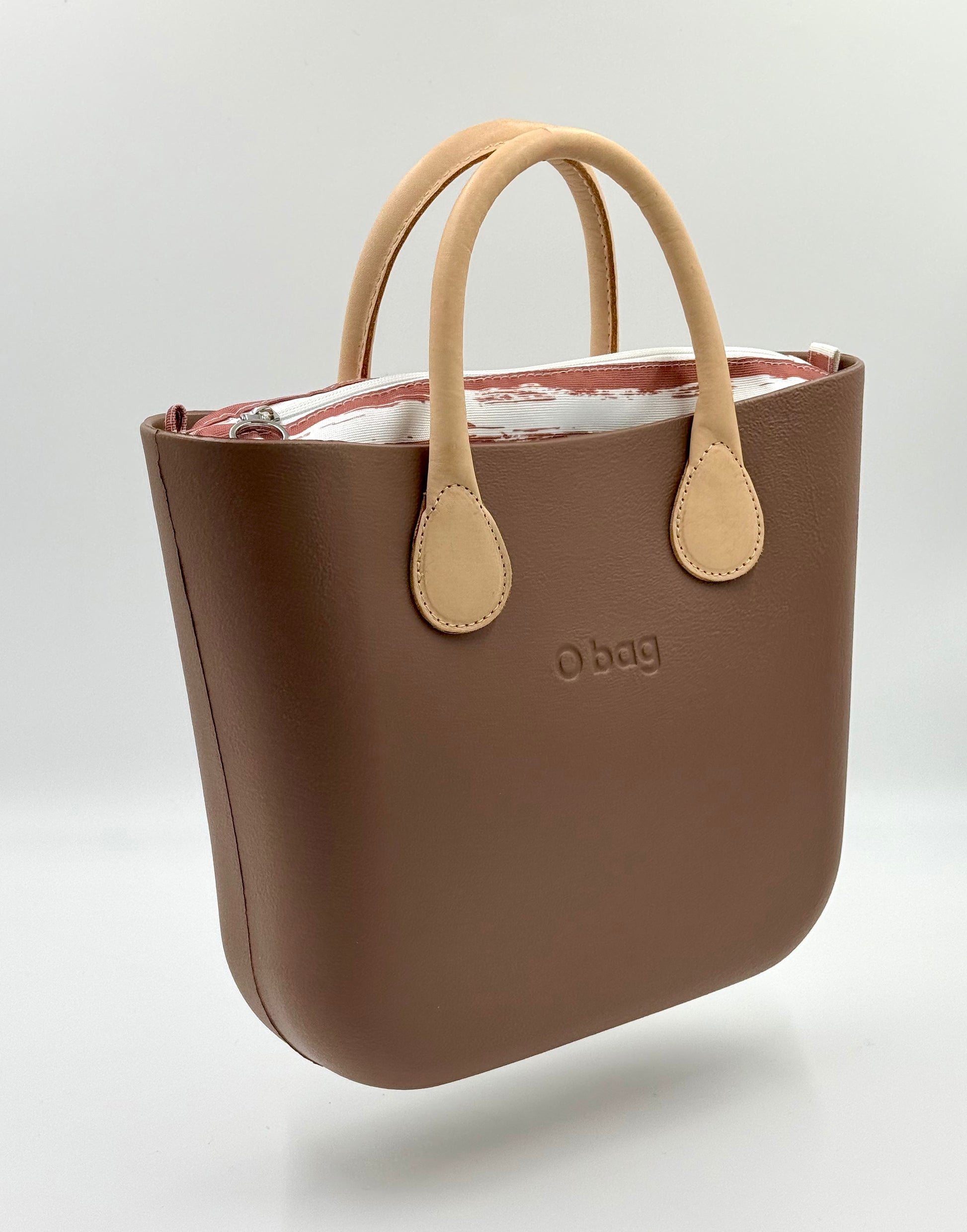 The O bag Mini is a feminine, compact bag for everyday use. The soft taupe/greige shade bag body is complemented by elegant cream-colored handles, and inside, a white-mauve striped zippered lining ensures your belongings are safe and organized.