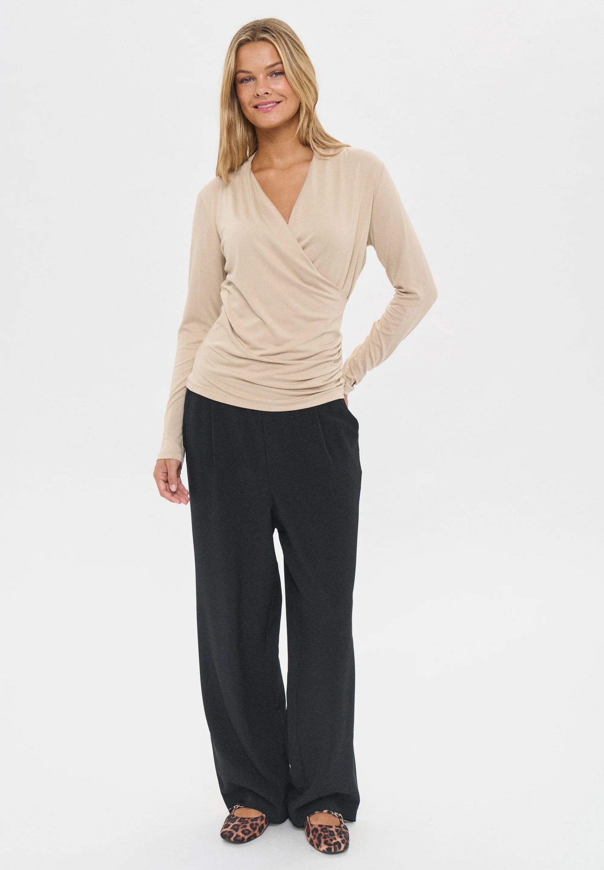 Style this sophisticated wrap top with black wide-leg trousers and heels for a chic office look, or pair it with dark denim and ankle boots for elevated casual style. The versatile oxford tan shade pairs beautifully with black, navy, cream, and earth tones, making it a wardrobe essential that transitions seamlessly from day to night.