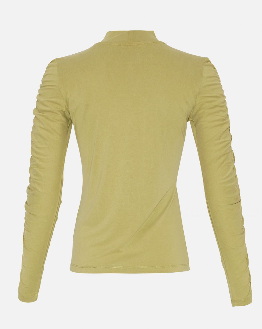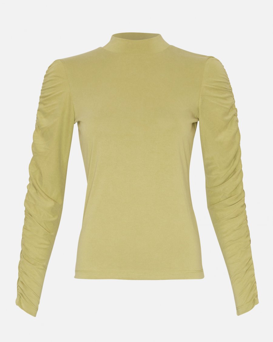 The MSCH Moselle Top is a understated yet distinctive long-sleeved top from Danish brand MSCH Copenhagen. The piece's characteristic features are the high neck, body-hugging, slightly slim fit, and the long, ruched, gathered-effect sleeves, which elevate the simple, solid-color top with discreet texture. This combination creates a feminine, clean and easily layerable staple that can be used for work, evening events or casual outfits alike.